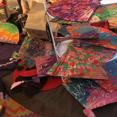 dyed scarves, embroidered greeting cards, embroidered necklaces, slippers, and more