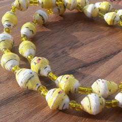 Lillian Amisi is a jewelry maker from the Democratic Republic of Congo. She specializes in paper beads, which are complex to create. She uses pieces of paper with various color patterns, rolls them around a toothpick, and coats the roll of paper in a varnish to seal it. Once she has beads of many different colors, she creates her design and strings them on nylon thread. She learned this jewelry-making technique in Uganda before coming to the U.S. Lillian is a Literacy Pittsburgh student and learning more English has helped her to get better jobs over the past few years. Her son, Emmanuel, was also a student in our program and is now in college.