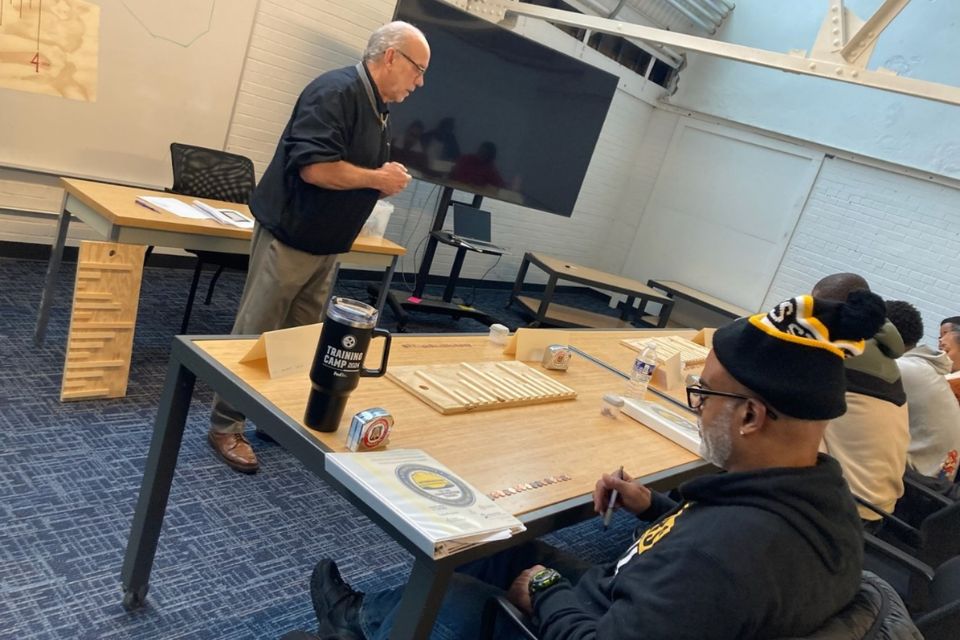 Students who are enrolled in the course, Introduction to Construction Trades, along with their Literacy Pittsburgh Instructor, Tina Burns, learn and work in a Pittsburgh landmark built during the Hill District’s heyday. The Energy Innovation Center opened as the Connelley Trade School in 1931, offering the opportunity to learn bricklaying and plastering, plumbing, auto mechanics, electrical wiring, carpentry, and more.