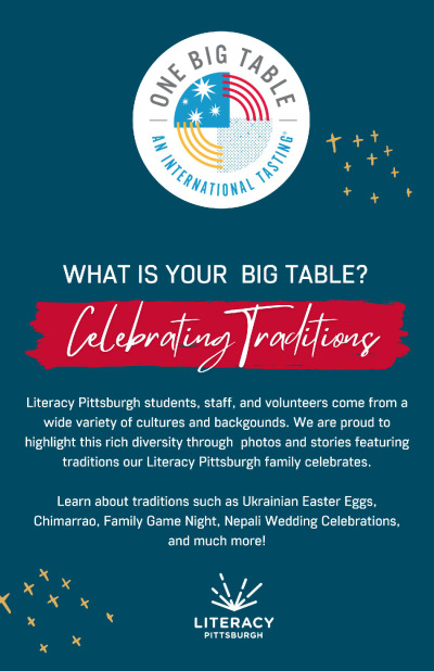 On March 13, more than 350 Literacy Pittsburgh friends gathered at Stage AE, helping us to raise more than $83,000 so our students can improve their reading, writing, math, English language, digital literacy, and workplace skills. One Big Table: An International Tasting celebrates the culture of our region through food, art, and entertainment.